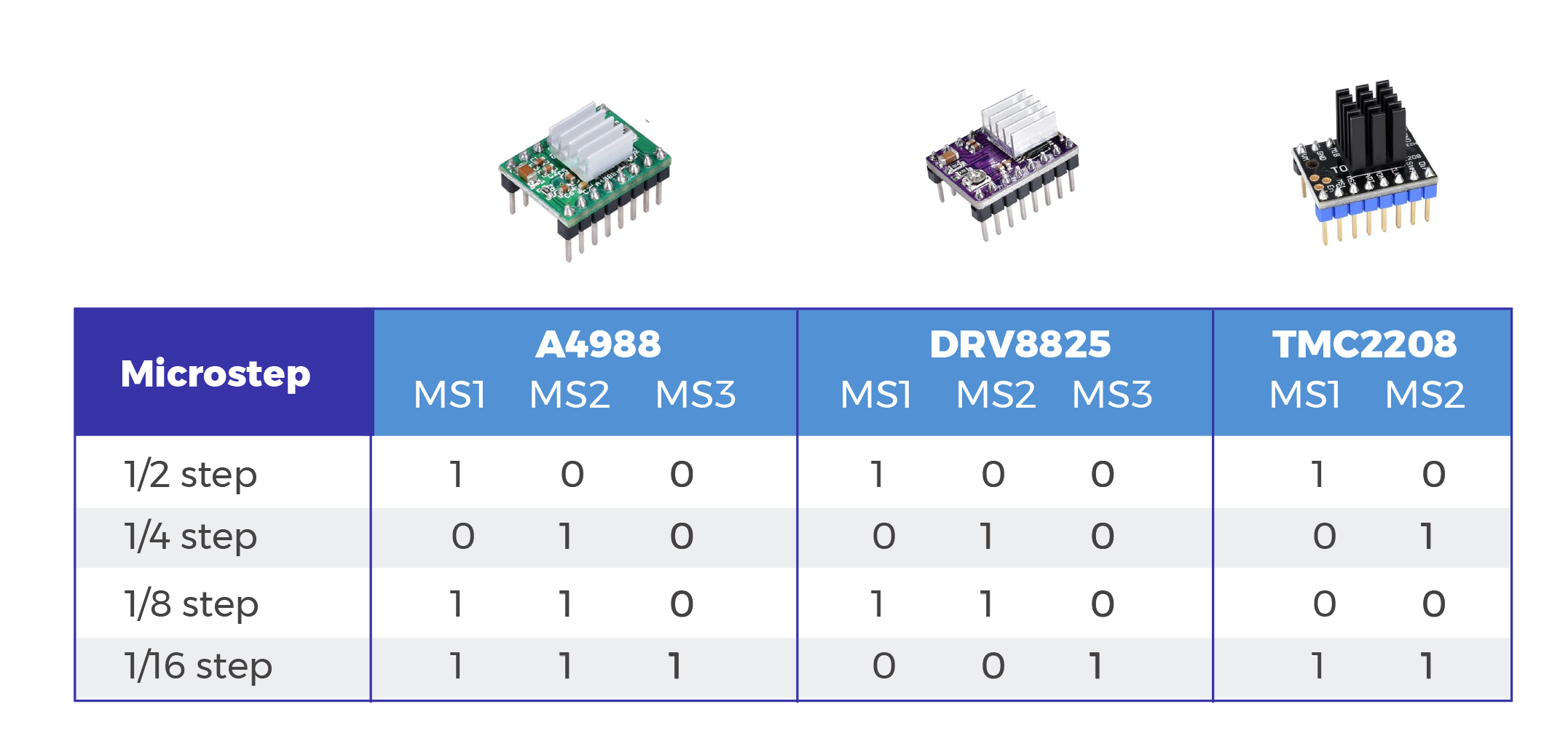 En la mayoría de los modelos de impresoras 3D se emplean drivers del tipo A4988. Estos dispositivos resultan confiables, económicos, se pueden adquirir con facilidad y permiten resoluciones de 1/2, 1/4, 1/8 y 1/16 microsteps. A su vez, los fabricantes han avanzado en la producción de controladores de mayor robustez, como los DRV8825, que superan a sus predecesores en varios aspectos destacables; mayor resolución (incorpora microstepping de 1/32), operan con mayor nivel de tensión y su intensidad máxima de corriente aumenta de 2 A 2.5 A.