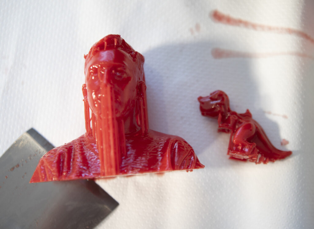 Tercero, una vez que terminamos de imprimir es necesario aplicarles a nuestras piezas un proceso de lavado y curado, el sentido de este proceso es quitar el excedente de resina líquida que queda sobre ellas y terminar de solidificar la impresión.