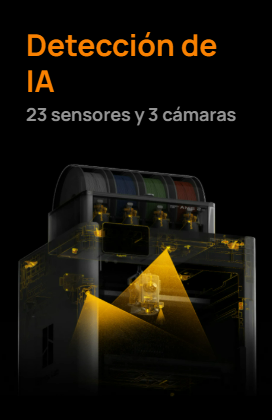 Gracias a tres cámaras integradas y múltiples sensores, la impresora supervisa cada impresión en tiempo real. Detecta errores de extrusión, fallos en la primera capa y acumulación de material, minimizando desperdicio y asegurando resultados consistentes incluso en piezas complejas.