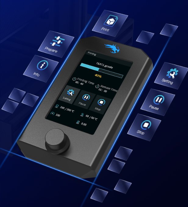 - Nueva interfaz de usuario mejorada. Se cambia la pantalla LCD monocromática por una pantalla a color de 4.3 pulgadas Tactil. La pantalla es casi igual al de la Ender 3 V2 pero se agrega la función de tactil.