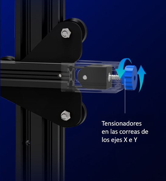 - Incluye tensionadores en las correas de los ejes X e Y. Estos facilitan el mantenimiento de las correas y el ajuste de las mismas.