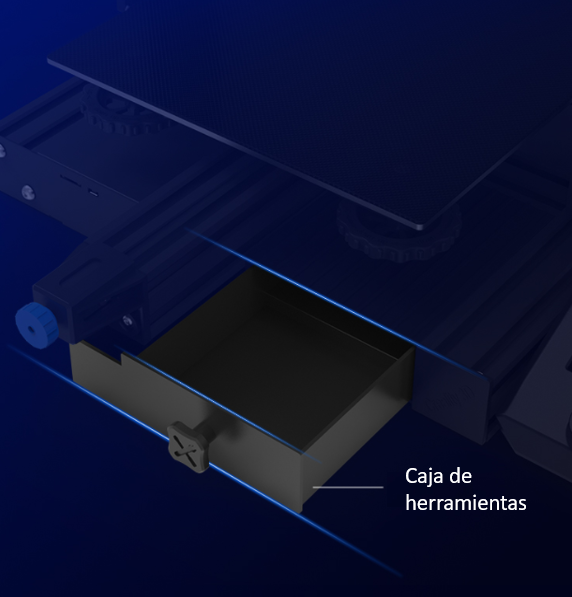 - Caja de herramientas. La Ender 3 V2 incluye una caja de herramientas al costado de la caja de la placa madre, aprovechando el espacio vacío que tenía la Ender 3 original. Esta caja permite guardar llaves allen, picos de repuesto, y demás herramientas que el cliente desee.