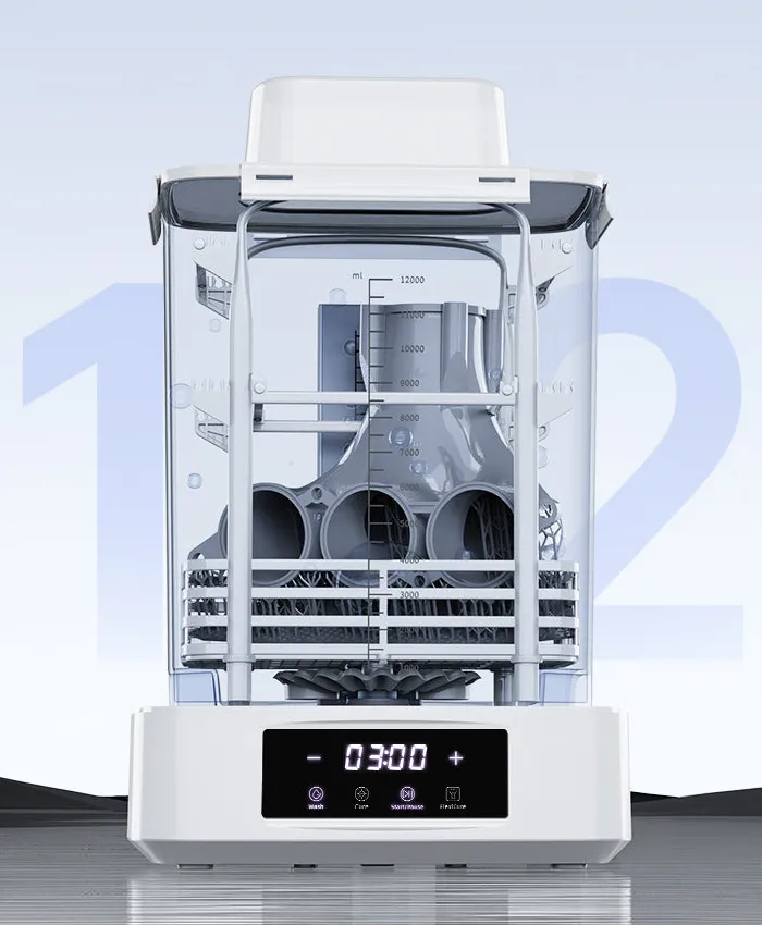 Postprocesar nunca fue tan fácil. Con modos de limpieza y curado seleccionables con un solo clic, este sistema simplifica el trabajo. La luz de cuello de ganso mejorada se activa y desactiva al instante, y la perilla rotativa infinita permite ajustar el tiempo de 1 a 30 minutos según cada necesidad.
