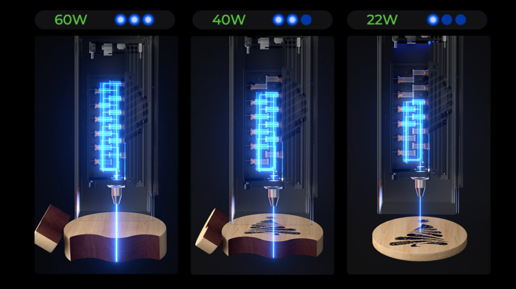 Con el ajuste inteligente del haz de luz, se puede adaptar la potencia a los módulos láser de 22 W, 40 W y 60 W de la Falcon Pro, ofreciendo la flexibilidad de utilizar tres potencias láser en un solo equipo.
